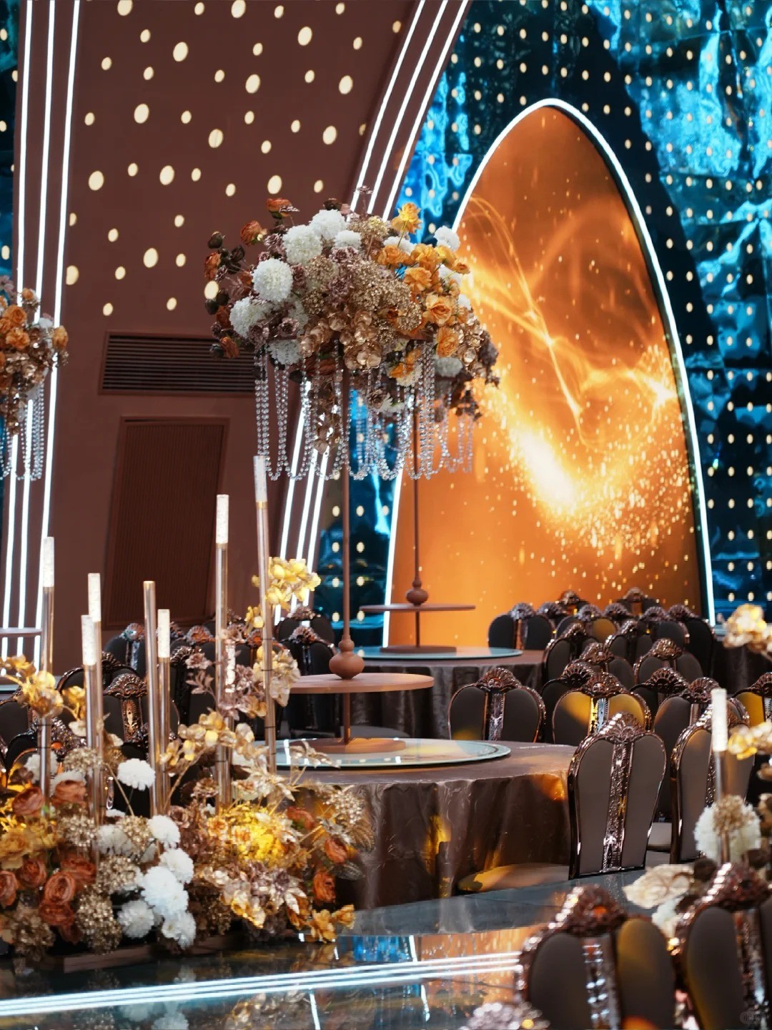 金色奥斯卡剧院风格,层高10米典雅大气 坐标:西安延平门 桌数:15-30桌 餐标:一千多 - LED、音响、话筒、舞台、化妆间都有配备 办婚宴|答谢宴|年会等等老钱的质感拉满 - 雁塔区备婚可以看看,整体是精致格调的效果 拍照原图直出