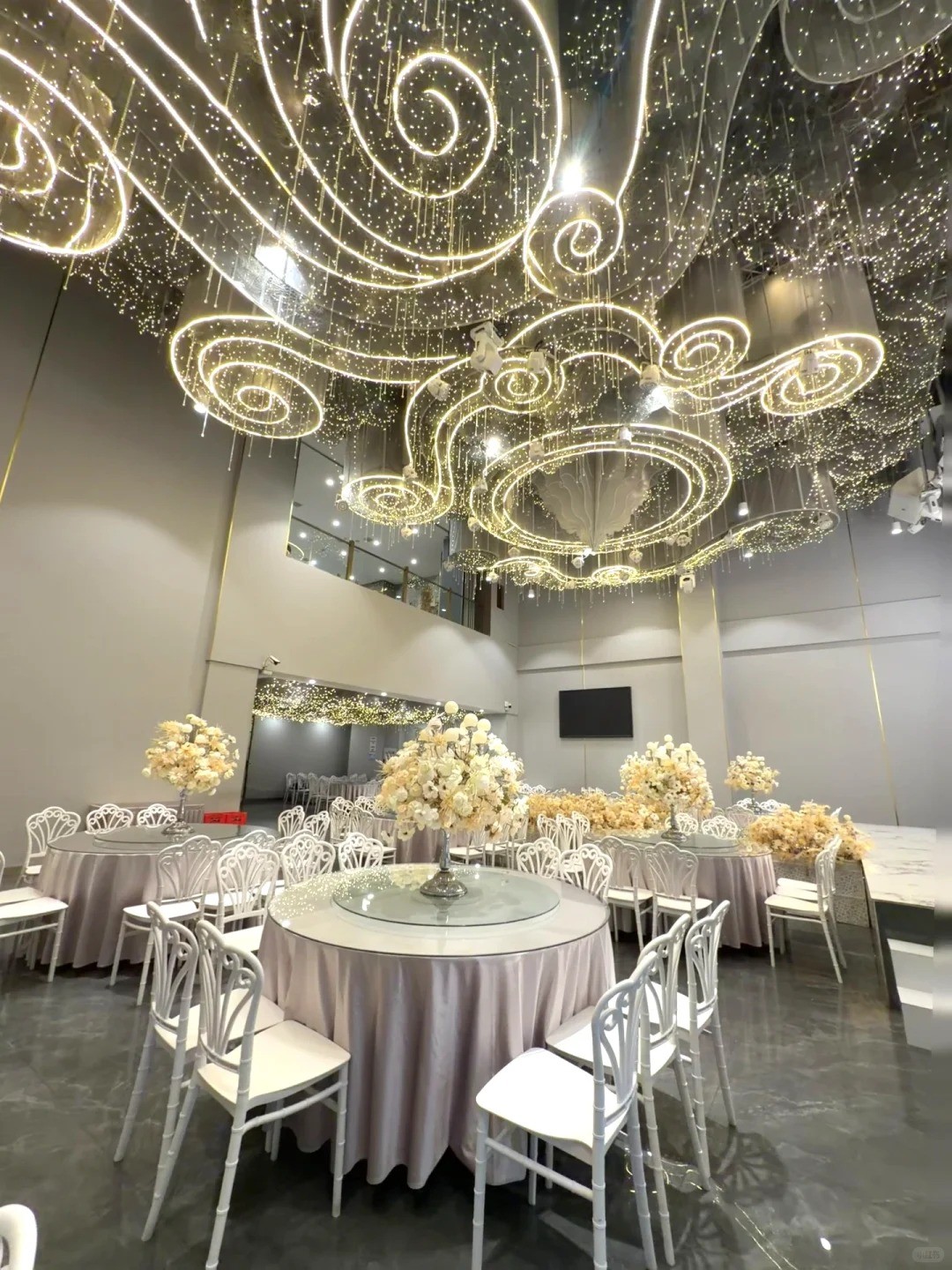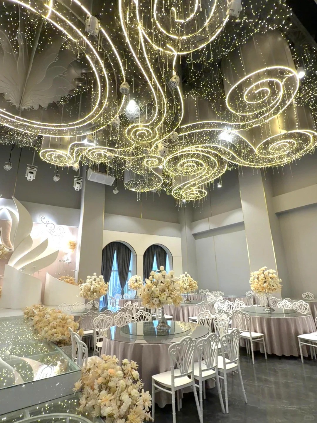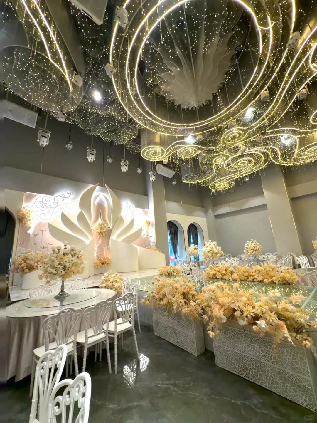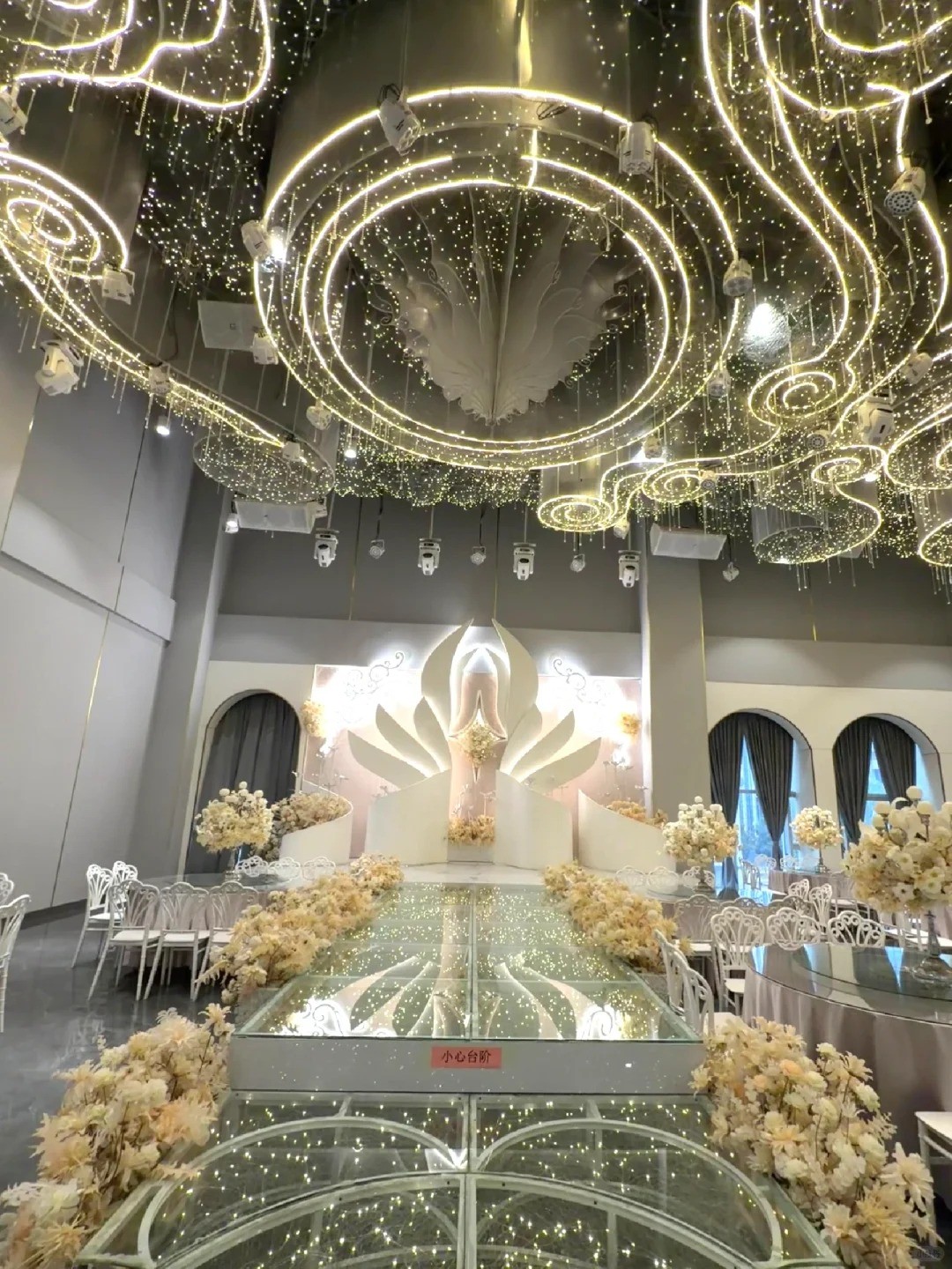 位置在渝北区中央公园、空港新城附近的,轻轨站也很近 3个主题婚礼堂,空髙12米无柱型,各有特色,有个新厅才装修出来的 容纳桌数:20-60桌 上图是3号厅,浅香槟色调,拍照蛮出片的 有大屏、音响灯光、四大金刚、茶坊这些的 婚宴、答谢宴、生日宴、宝宝宴都可举办